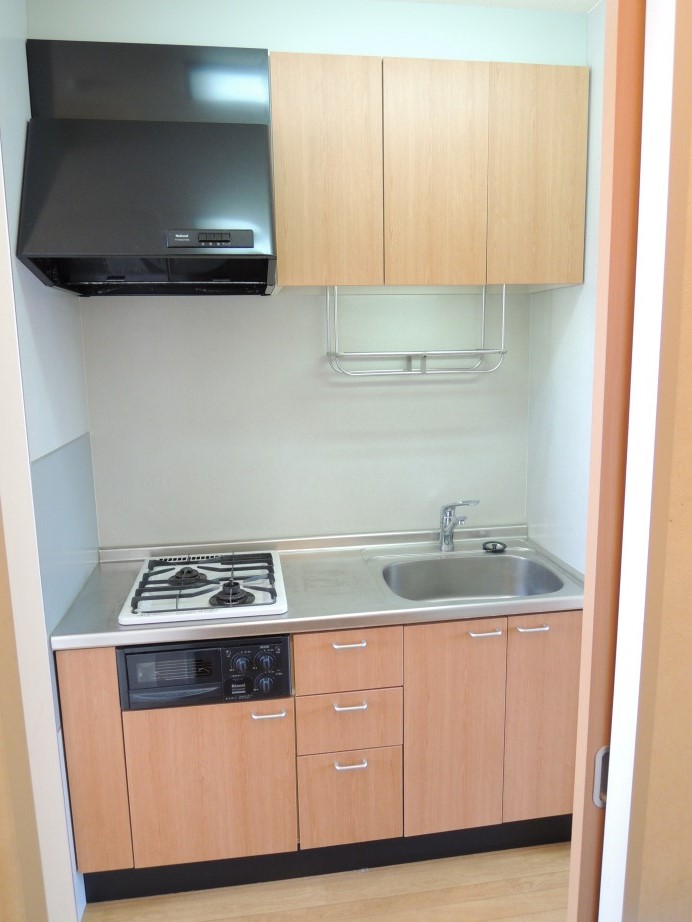 キッチンはコンパクトですが、1人分の食事を作るには十分です。
