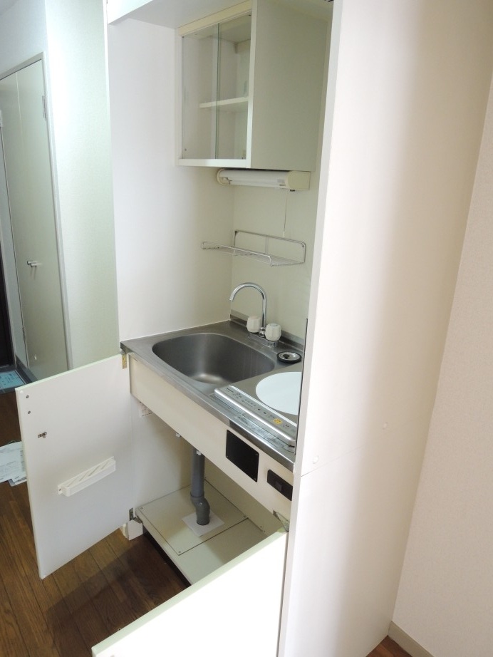 キッチンはコンパクトですが、1人分の食事を作るには十分です。